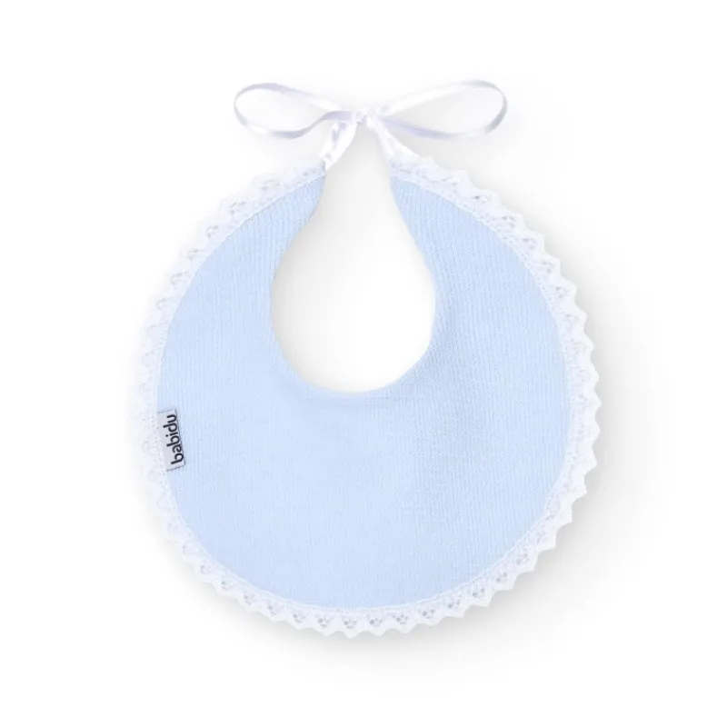 Babero redondo con puntilla en tejido canutillo. COMPOSICIÓN: 100% ALGODÓN. CUIDADOS: Lavar a máquina – agua fría (30 ° max). PRESENTACIÓN: Bolsa