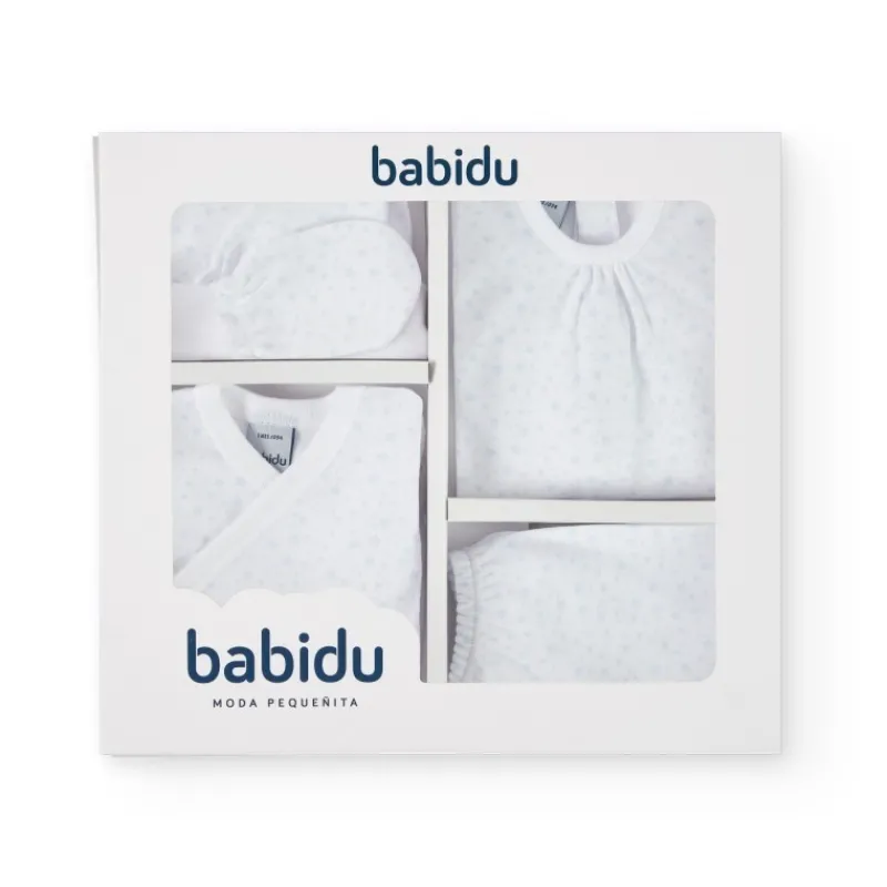 Pack nacimiento, compuesto por Body cruzado, conjunto de dos piezas , gorro y manoplas. Un hermoso regalo de 5 piezas para dar la bienvenida al bebé recién nacido, presentado en una tierna y delicada caja de regalo.