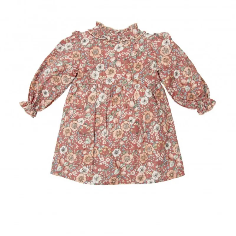 Vestido de bebé niña con estampado floral, volantes y botones de madera, confeccionado en 100% algodón suave.